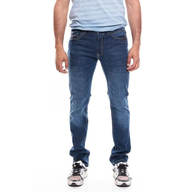 Jean 5 poches, coupe droite ajustée, en coton stretch à effet délavé. Braguette zippée et bouton métal à la taille. Ceinture à passants. 2 poches avant rivetées et 1 poche ticket. 2 poches arrières plaquées rivetées et 1 fausse poche zippée. Surpiqures apparentes et effet plissé aux cuisses. Sangle fantaisie boutonnée sur la ceinture au dos. Coloris bleu denim délavé. 98% coton, 2% élasthanne. Lavage en machine à 40°.